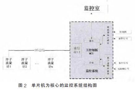 浮子流量計監(jiān)控系統主要功能是模擬量采集輸出, 數字量采集輸出,由核心模塊進行分析、處理、存儲并和上位機通信。工業(yè)上常用的監(jiān)控系統,從組成結構來看主要分為PLC為核心的監(jiān)控系統、現場總線為核心的監(jiān)控系統、單片機為核心的監(jiān)控系統。本設計主要采用以單片機為核心的監(jiān)控方法,該系統使用廣泛,體積小、功耗低、操作方便、設計簡便、成本低,是許多小型監(jiān)控系統的*選。單片機為核心的監(jiān)控系統結構如圖2所示。本監(jiān)測系統主要包括現場浮子流量計組、485總線、主控制板MCU 以及模擬數字輸出控制模塊。