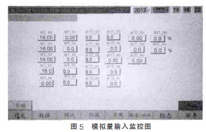 上位機觸控屏軟件是利用觸控屏供應商的組態(tài)軟件設計的,作為一個將運用于工業(yè)現場的監(jiān)控設備,其實用性和易用性是使用者比較重視的。當下位機的通訊任務接收到信號量, 主控制模塊就會開始和上位機通信。下位機將采集到處理完整的數據傳輸到上位機內,上位機將其顯示到觸控屏上,使用者可以通過上位機了解空壓機組的實時狀態(tài)。圖5 和圖6 就是模擬量和數字量各個通道的實時值顯示畫面。