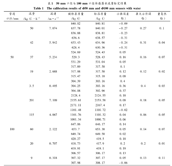 為了評測系統(tǒng)的實際應(yīng)用效果,進行了水流量標(biāo)定實驗。分別針對50mm口徑與100mm口徑的傳感器進行標(biāo)定。系統(tǒng)勵磁方式采用方波勵磁,勵磁頻率為12.5Hz,管道*大流速為7m/s左右,*小流速為0.3 m/s左右,標(biāo)定結(jié)果如表1所示。