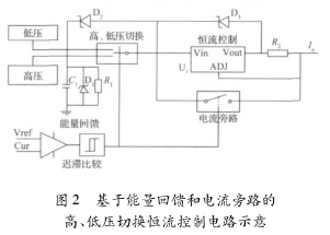 高、低壓切換恒流控制電路是勵(lì)磁控制系統(tǒng)中的關(guān)鍵部分,由高、低壓電源、能量回饋電路、高低壓切換電路、恒流控制電路、電流旁路電路和遲滯比較電路組成,其電路原理如圖2所示。