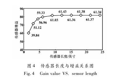 采用一臺日徑為6英寸、標(biāo)準(zhǔn)線圈的傳感器,改變傳感器長度,依次進(jìn)行試驗室標(biāo)定試驗。傳感器長度與增益的關(guān)系圖如圖4所示。當(dāng)傳感器長度為9. 1英寸時,其增益為61. 03;但當(dāng)其長度繼續(xù)增加時,增益變化較小;當(dāng)其長度6. 1英寸減小到0時,增益從59. 33開始下降。也就是說,當(dāng)傳感器長度為6. 1-9. 1英寸時,既有效利用了線圈產(chǎn)生的磁場,又可使傳感器長度較短。