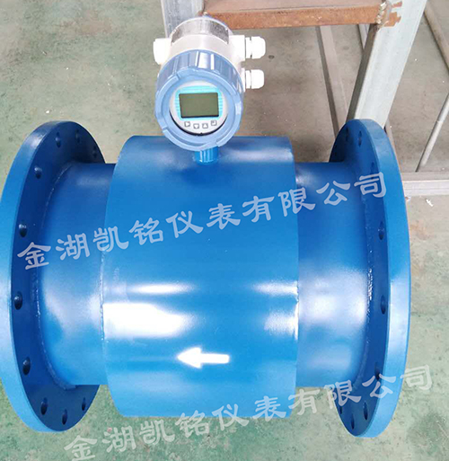 凱銘電磁流量計是以內(nèi)襯絕緣材料做為非導磁合金短管;兩只電極沿管徑方向穿通壁固定在測量管上,其電極頭與襯里內(nèi)表面基本齊平。勵磁線圈由雙向方波脈沖勱磁時,將在與測量管軸線垂直的方向上產(chǎn)生一磁通量密度為B的工作磁場;此時,如果具有一定電導率的液體流經(jīng)測量管,將切割磁力線感應出電動勢E,電動勢E正比于磁通量密度B,測量管內(nèi)徑d與平均流速V 的乘積。電動勢E(流量信號)由電極檢出并通過電纜送至轉換器。轉換器將流量信號放大處理后,可顯示流體流量,并能輸出脈沖,摸擬電流等信號,用于流量的控制和調(diào)節(jié)。