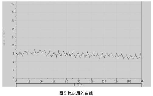 圖4、圖5中所示曲線為測量過程中所截取的集流傘中所聚集的氣相,通過排氣通道排出時與排出后的測量曲線。測試過程中錄取到的儀器排氣的過程,當(dāng)集流傘完全支開后仍需要開啟流量測試進(jìn)行實(shí)時檢測,否則可能會錄取資料失真。
