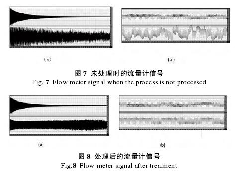 圖 7 為未處理時流量計輸出的傳感器信號和放大器輸出信號。圖 7(a)上部為傳感器輸出的原始信號,下部為放大器輸出信號;