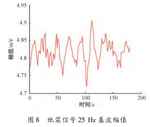 在頻域中對(duì)紙漿信號(hào)觀察時(shí)發(fā)現(xiàn),紙漿信號(hào)的漿液噪聲頻帶在零頻率點(diǎn)附近,距離流量信號(hào)基波頻率點(diǎn)較遠(yuǎn),對(duì)基波幅值和各奇次諧波幅值基本沒(méi)有影響,紙漿信號(hào)在頻域中的圖形如圖7所示。選擇一組采集的紙漿信號(hào),把其等分成數(shù)段,利用MATLAB計(jì)算每段數(shù)據(jù)在基波處的幅值并提取保存在一個(gè)數(shù)組中,使用繪圖工具畫(huà)出來(lái),如圖8所示??梢?jiàn),基波幅值在4.7~4.95mV變化,波動(dòng)較小。因此,提取到的與流量相關(guān)的感應(yīng)電動(dòng)勢(shì)信號(hào)幅值會(huì)比較穩(wěn)定。