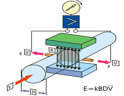 電磁流量計(jì)的工作原理是基于法拉*電磁感應(yīng)定律。在測(cè)量管內(nèi)的導(dǎo)電介質(zhì)相當(dāng)于法拉*試驗(yàn)中的導(dǎo)電金屬桿,上下兩端的兩個(gè)電磁線圈產(chǎn)生恒定磁場(chǎng)。當(dāng)有導(dǎo)電介質(zhì)流過時(shí),則會(huì)產(chǎn)生感應(yīng)電壓。管道內(nèi)部的兩個(gè)電極測(cè)量產(chǎn)生的感應(yīng)電壓。
