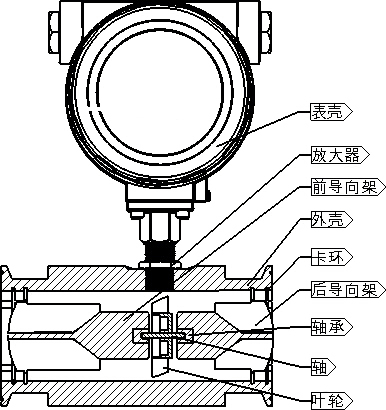 圖所示為渦輪流量傳感器結構簡圖,由圖可見,當被測流體流過傳感器時,在流體作用下,葉輪受力旋轉,其轉速與管道平均流速成正比,葉輪的轉動周期地改變磁電轉換器的磁阻值。檢測線圈中的磁通隨之發(fā)生周期性變化,產生周期性的感應電勢,即電脈沖信號,經放大器放大后,送至顯示儀表顯示。