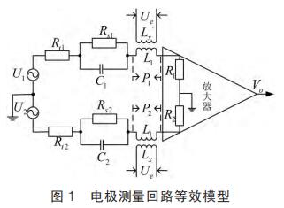 測(cè)量電極與流體介質(zhì)接觸時(shí)會(huì)發(fā)生電化學(xué)反應(yīng)在電極-溶液界面形成阻抗,通常由法拉*阻抗與雙電層電容并聯(lián)組成。 法拉*過(guò)程分為電荷傳遞過(guò)程和擴(kuò)散過(guò)程,相應(yīng)的法拉*阻抗由電荷傳遞電阻與擴(kuò)散阻抗串聯(lián)組成。一般化工原料流量計(jì)的勵(lì)磁頻率大于1Hz,而擴(kuò)散阻抗發(fā)生在更低頻率內(nèi),不考慮擴(kuò)散過(guò)程,電極等效阻抗為電荷傳遞電阻與雙電層電容并聯(lián)后再與電極接觸電阻串聯(lián)。 基于電極阻抗建立的電極等效測(cè)量回路如圖 1 所示。圖中:Rs1 和 Rs2 為電荷傳遞電阻;C1 和 C2 為雙電層電容;Rt為兩個(gè)測(cè)量電極間的接觸電阻滿足 Rt=Rt1+Rt2;Lx 為勵(lì)磁線圈等效電感;L1 為閉合回路等效電感;R1 和 R2 為放大器輸入電阻;P1和 P2 為由“變壓器效應(yīng)”疊加在測(cè)量電極上的微分干擾;U1 為流體切割磁力線產(chǎn)生的感應(yīng)電勢(shì);Ue 為勵(lì)磁電壓。 假設(shè)磁感應(yīng)強(qiáng)度由勵(lì)磁電流決定且成正比關(guān)系即 B=aI,忽略串模等干擾則電極間電壓為感應(yīng)電勢(shì)與微分干擾的疊加,基本方程如下: