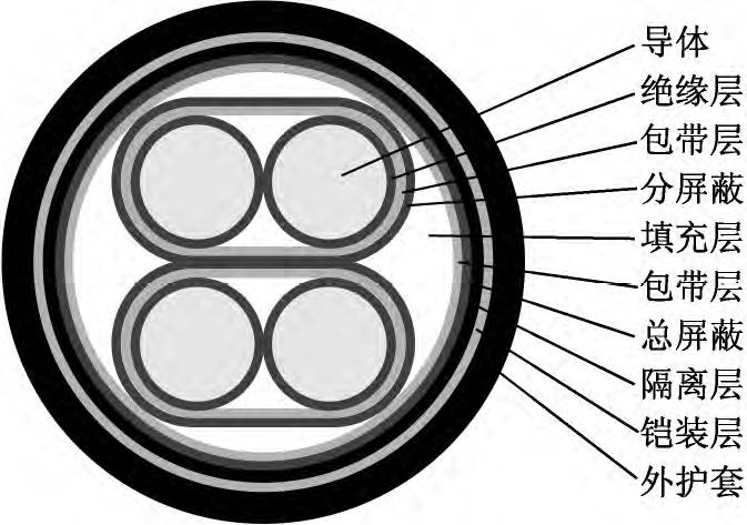 該新型電纜的結(jié)構(gòu)如圖1所示。導(dǎo)體為單股退火鍍錫軟銅線,以提高導(dǎo)體的導(dǎo)電性和防腐蝕性。在導(dǎo)體外繞包一層?。疲矗ň鬯姆蚁┌雽?dǎo)電帶,有利于降低導(dǎo)體和絕緣之間的摩擦起電噪音。絕緣采用材料較為純凈、介電常數(shù)較小、具有一定彈性的聚丙烯絕緣級材料,并采用擠壓式擠出,減小絕緣層與導(dǎo)體的間隙。采用對絞組作為信號傳輸線,由于在兩根傳輸線上感應(yīng)的電壓接近相等,減小了電壓差值,提高了信號傳輸穩(wěn)定性;對絞組由兩種不同顏色絕緣線芯組成,相鄰線對對絞節(jié)距應(yīng)不大于100mm。對絞分屏蔽組(即對對絞組進(jìn)行分屏蔽,每對對絞組外繞包兩層聚酯帶和一層厚0.04mm鋁塑復(fù)合帶繞包,內(nèi)置一根7×0.26mm鍍錫銅絞線作引流線)有利于對不同對絞組之間信號串音的抑制和隔離。對絞分屏蔽組同心式絞合成纜,在對絞分屏蔽組間填充非吸濕性材料,以保證纜芯圓整。在成纜纜芯外繞包兩層聚酯帶,再采用鋁塑復(fù)合帶繞包,內(nèi)置鍍錫銅線作引流線,以提高電纜電磁屏蔽能力??偲帘螌油鈹D包隔離層(隔離護(hù)套),隔離層采用絕緣級低密度聚乙烯材料。隔離層外采用鎧裝層,鎧裝材料為高導(dǎo)磁合金鋼帶,其為強(qiáng)磁材料,可將外來的磁通大部分限制在鎧裝層的外表面上(僅有少部分能進(jìn)入被屏蔽的空間);鎧裝時對高導(dǎo)磁合金鋼帶采用縱包焊接,確保其形成一連續(xù)圓柱管;鎧裝層可提高電纜抗電磁干擾水平以及對電纜進(jìn)行加強(qiáng),減少電纜振動引起的電動勢。外護(hù)套采用藍(lán)色軟PVC(聚氯乙烯)護(hù)層級電纜材料擠包,實(shí)現(xiàn)電纜防護(hù)。