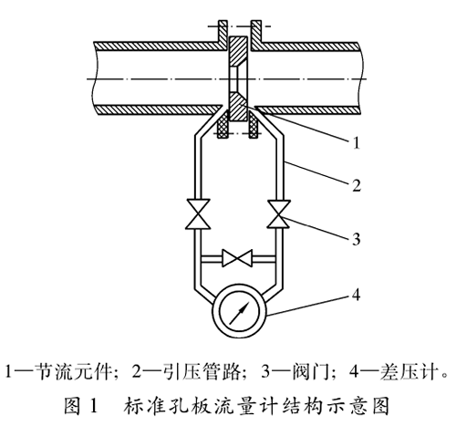 標準管道煙氣流量計結(jié)構(gòu)如圖1所示,包括節(jié)流元件(標準孔板及其取壓裝置)、傳輸壓差信號的引壓管路、閥門以及差壓計等部分。標準孔板是壓差測量時的一次元件,人們利用它在管道內(nèi)使流體產(chǎn)生壓差,再通過引壓管路把孔板前、后產(chǎn)生的壓差傳送給差壓變送器,再輸人到二次儀表,從而顯示出管道內(nèi)流體的靜壓、壓差、瞬時流量和累計流量等計量參數(shù)。