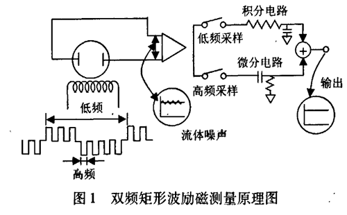 雙頻矩形波勵磁測量原理如圖l所示,一個由高低頻分量迭加而成的電磁場通過勵磁線圈被施加到被測液體中,勵磁波形是在一個低頻矩形波上迭加一個高于市電頻率的矩形波而得到的波形。在產(chǎn)生的電動勢中,低頻分量通過一個大時間常數(shù)的積分電路獲得一個零點穩(wěn)定性好的平穩(wěn)流量信號。而由漿液或低電導率流體產(chǎn)生的低頻噪聲可被不受噪聲影響的高頻采樣電路所抑制,有著同樣時間常數(shù)的流量信號經(jīng)過一個差分電路以確定流速信號的變化,把這兩種不同頻率采樣所得的信號結(jié)合起來可獲得一個穩(wěn)定流速信號,該信號不受噪聲干擾,且有較高的零點穩(wěn)定性。