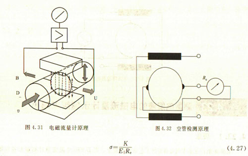 非滿管檢測(cè)也是基于電導(dǎo)率檢側(cè)的方法。在圖4.33所示的電磁流量傳感器中,增加了一個(gè)(或一對(duì))非滿管檢測(cè)電極。當(dāng)導(dǎo)管內(nèi)液體滿管時(shí),頂部電極與其他電極之間的電阻值很小;而當(dāng)存在非滿管情況時(shí),頂部電極與導(dǎo)電液體之間有氣體阻隔,所以電極電阻顯著增大,從而做出非滿管判斷。