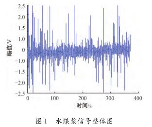針對反應(yīng)釜冷水流量計(jì)測量水煤漿時(shí)出現(xiàn)較大波動(dòng),甚至回零這一問題,特去某煤化工企業(yè)甲醇分公司進(jìn)行現(xiàn)場數(shù)據(jù)采集。該公司所使用的對置式四噴嘴氣化有4個(gè)噴嘴,噴嘴管道口徑為125mm,管中水煤漿流量基本穩(wěn)定在19m³/h(流速約為0.48m/s)。每條噴嘴煤漿線上安裝了3臺(tái)反應(yīng)釜冷水流量計(jì),每臺(tái)反應(yīng)釜冷水流量計(jì)由傳感器和變送器兩部分組成。選擇其中1條水煤漿管線上的1臺(tái)反應(yīng)釜冷水流量計(jì)進(jìn)行數(shù)據(jù)采集,因?yàn)樵撆_(tái)反應(yīng)釜冷水流量計(jì)測量結(jié)果波動(dòng)大,甚至出現(xiàn)回零的現(xiàn)象。將課題組研制的基于DSP的電磁流量變送器的信號(hào)線和勵(lì)磁線接到該電磁流量傳感器的電極和勵(lì)磁線圈上,組合成完整的反應(yīng)釜冷水流量計(jì),進(jìn)行水煤漿數(shù)據(jù)采集。使用的電磁流量變送器是以TI公司DSP芯片TMS320F28335為核心,采用高頻勵(lì)磁方案,其硬件主要包括勵(lì)磁控制系統(tǒng)和信號(hào)采集處理系統(tǒng),具體的模塊有勵(lì)磁驅(qū)動(dòng)模塊、信號(hào)調(diào)理采集模塊、信號(hào)處理控制模塊、人機(jī)接口模塊、通信模塊及電源管理模塊。信號(hào)調(diào)理采集模塊中的調(diào)理電路對一次儀表輸出的信號(hào)進(jìn)行放大和濾波,截止頻率是2kHz,放大倍數(shù)約為230倍。通過NI公司USB-6216型號(hào)的數(shù)據(jù)采集卡進(jìn)行數(shù)據(jù)采集,把調(diào)理電路的輸出端連接到數(shù)據(jù)采集卡的一個(gè)差分輸入端,并設(shè)置數(shù)據(jù)采集卡工作在差分的測量模式,設(shè)置采集卡的采樣頻率為10kHz。采集多組水煤漿信號(hào)數(shù)據(jù),每組數(shù)據(jù)的時(shí)間長度為5min。