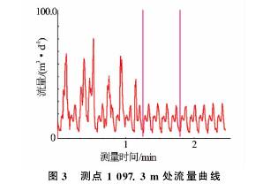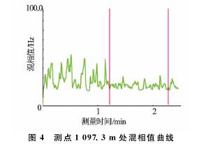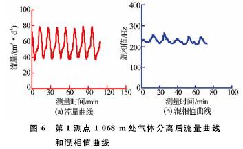 T-××-××1井是大慶油田采油五廠1口水驅產出井,采用阻抗式含水率計在該井進行了測試。圖3、圖4分別為測點深度1097.3m測量的流量及混相值曲線圖。2min的采樣時間內,流量及混相值曲線波動劇烈,明顯受井下產氣影響,進行平均值計算時只能取后半段較平穩(wěn)的數(shù)據(jù),因此,測試時需延長測量時間。錄取不同范圍數(shù)值時流量及含水率測量差值較大,流量平穩(wěn)段為14.81m3/d,高值時達到23.52m3/d;取不同測量段的混相值時測量含水率*大相差12%。重復測量得到了相同的測量結果。由此可見,氣體對流量及含水率測量產生了非常大的測量誤差。