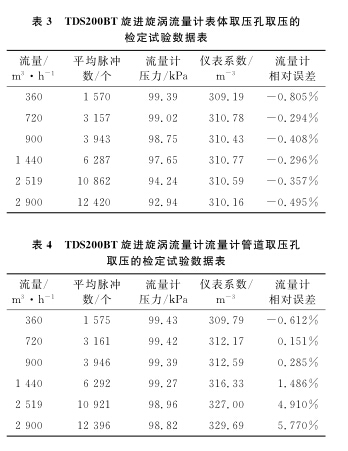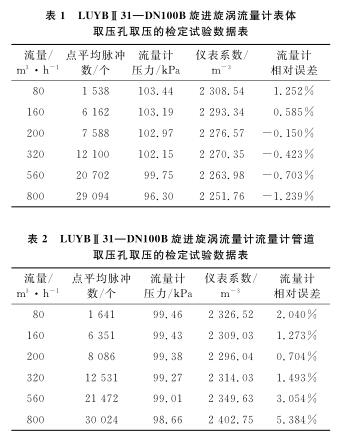 以使用廣泛的DN100B空氣流量計為例,系統(tǒng)運行時間為60s,標(biāo)準(zhǔn)裝置的滯止平均溫度為28.9℃,空間平均濕度為30%,流量計的平均溫度為28.3℃,在表體取壓孔取壓和管道取壓孔取壓的流量計檢定試驗數(shù)據(jù)分別如表1、2所示。