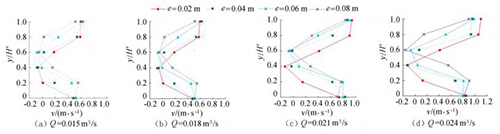 圖4橫坐標(biāo)為斷面水流方向流速,縱坐標(biāo)為測(cè)點(diǎn)垂向位置與下游水位的比值y/H'。隨著浮體結(jié)構(gòu)位置的上升,*小斷面流速位置同樣上升。以圖3(a)為例,當(dāng)e=0.02m時(shí),下游斷面位置自下而上呈現(xiàn)先減小、后增大的趨勢(shì),在y/H'=0.40時(shí)流速達(dá)到*小,隨著浮體結(jié)構(gòu)位置的上升,*小流速呈現(xiàn)向上偏移的趨勢(shì)。在斷面位置y/H'=0.20時(shí),隨著e的增大,流速呈現(xiàn)增大的趨勢(shì)。當(dāng)e較小時(shí),流經(jīng)浮體結(jié)構(gòu)下部進(jìn)行下泄的水流較少,主流出現(xiàn)在浮體結(jié)構(gòu)的上部,且在浮體結(jié)構(gòu)的阻擋作用下出現(xiàn)回流區(qū);隨著e上升,主流偏向浮體結(jié)構(gòu)下部區(qū)域,流速增大。與y/H'=0.20的流速分布正好相反,當(dāng)y/H'=0.80時(shí),流速分布隨著浮體位置的增大而減小。隨著e的增大,通過(guò)浮體結(jié)構(gòu)下部泄流的水體增多,主流開(kāi)始向下偏移。試驗(yàn)過(guò)程中,浮體結(jié)構(gòu)處于淹沒(méi)狀態(tài),流速的分布隨著浮體位置的改變呈現(xiàn)上大、中小、下大的分布趨勢(shì),在浮體結(jié)構(gòu)下游區(qū)域形成回流區(qū),回流區(qū)的位置隨著浮體結(jié)構(gòu)的上升而上升。