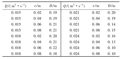 表3中,當(dāng)來(lái)流流量較小時(shí)(Q=0.015m3/s),回流區(qū)的長(zhǎng)度D隨著浮體結(jié)構(gòu)位置的增大逐漸增大;當(dāng)來(lái)流流量較大時(shí)(Q=0.024m3/s),回流區(qū)的長(zhǎng)度卻隨著浮體結(jié)構(gòu)位置的增大呈現(xiàn)減小的趨勢(shì)。試驗(yàn)過(guò)程中,當(dāng)浮體結(jié)構(gòu)位置較高且來(lái)流較小時(shí),浮體結(jié)構(gòu)上下部區(qū)域的主流流速較小,回流區(qū)范圍較大;浮體結(jié)構(gòu)位置不變時(shí),來(lái)流流量增大,回流區(qū)長(zhǎng)度減小。來(lái)流增加,下泄水流流速較大,并迅速將回流區(qū)內(nèi)的水流帶入下游區(qū)域,因此回流區(qū)長(zhǎng)度反而呈現(xiàn)減小趨勢(shì)。