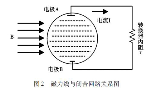 2. 1 正交干擾衛(wèi)生型卡箍電磁流量計的磁路系統(tǒng)包含有兩個勵磁線圈,而導(dǎo)管內(nèi)的液體與傳感器電極及轉(zhuǎn)換器結(jié)構(gòu)組成了一個閉合的回路,如圖2 所示。理論情況下,磁力線( 圖中B) 應(yīng)與閉合回路相平行,但是由于裝配過程中的誤差,導(dǎo)致磁力線不可能完全平行于這一閉合回路,出現(xiàn)部分磁力線成一定角度穿過回路的現(xiàn)象,這引起了即使沒有液體流動的情況下,傳感器的電極上也會產(chǎn)生感應(yīng)電動勢,就形成了正交干擾的基本形式。