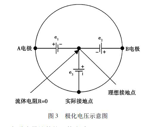 在被測液體與電極和接液部件接觸過程中,電解質(zhì)中的正負離子會分別作定向運動,這會使被測液體在電極和接液部件之間形成電位差,通常將這種現(xiàn)象稱為極化現(xiàn)象。如圖3 所示,理論上來說,兩電極A 和B 對接液部件的電位e1、e2大小相等、方向相反,此時兩電極的電位差等于零。但是,若兩電極的材質(zhì)或表面狀態(tài)存在差異,此時A、B 電極之間的電位差就不為零,這就形成了極化電壓,極化電壓與共模狀態(tài)的電壓e3一起疊加在流量信號中,被輸入轉(zhuǎn)換器的差動放大器。當極化電壓過大,則會對差動放大器的輸入端造成較大影響,導(dǎo)致信號無法放大或流量信號的輸出波動過大,從而降低了衛(wèi)生型卡箍電磁流量計的測量精度。