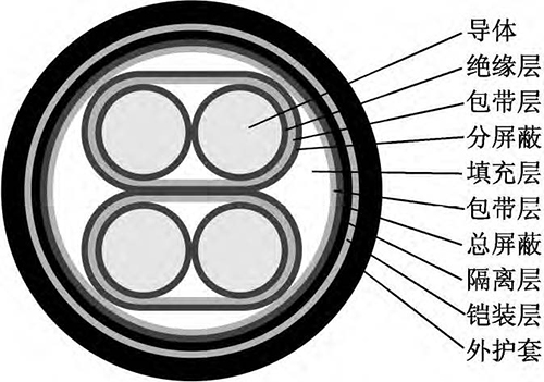 該新型電纜的結(jié)構(gòu)如圖1所示。導(dǎo)體為單股退火鍍錫軟銅線,以提高導(dǎo)體的導(dǎo)電性和防腐蝕性。在導(dǎo)體外繞包一層薄F4(聚四氟乙烯)半導(dǎo)電帶,有利于降低導(dǎo)體和絕緣之間的摩擦起電噪音。絕緣采用材料較為純凈、介電常數(shù)較小、具有一定彈性的聚丙烯絕緣級材料,并采用擠壓式擠出,減小絕緣層與導(dǎo)體的間隙。采用對絞組作為信號傳輸線,由于在兩根傳輸線上感應(yīng)的電壓接近相等,減小了電壓差值,提高了信號傳輸穩(wěn)定性;對絞組由兩種不同顏色絕緣線芯組成,相鄰線對對絞節(jié)距應(yīng)不大于100mm。對絞分屏蔽組(即對對絞組進(jìn)行分屏蔽,每對對絞組外繞包兩層聚酯帶和一層厚0.04mm鋁塑復(fù)合帶繞包,內(nèi)置一根7×0.26mm鍍錫銅絞線作引流線)有利于對不同對絞組之間信號串音的抑制和隔離。對絞分屏蔽組同心式絞合成纜,在對絞分屏蔽組間填充非吸濕性材料,以保證纜芯圓整。在成纜纜芯外繞包兩層聚酯帶,再采用鋁塑復(fù)合帶繞包,內(nèi)置鍍錫銅線作引流線,以提高電纜電磁屏蔽能力??偲帘螌油鈹D包隔離層(隔離護(hù)套),隔離層采用絕緣級低密度聚乙烯材料。隔離層外采用鎧裝層,鎧裝材料為高導(dǎo)磁合金鋼帶,其為強(qiáng)磁材料,可將外來的磁通大部分限制在鎧裝層的外表面上(僅有少部分能進(jìn)入被屏蔽的空間);鎧裝時對高導(dǎo)磁合金鋼帶采用縱包焊接,確保其形成一連續(xù)圓柱管;鎧裝層可提高電纜抗電磁干擾水平以及對電纜進(jìn)行加強(qiáng),減少電纜振動引起的電動勢。外護(hù)套采用藍(lán)色軟PVC(聚氯乙烯)護(hù)層級電纜材料擠包,實(shí)現(xiàn)電纜防護(hù)。