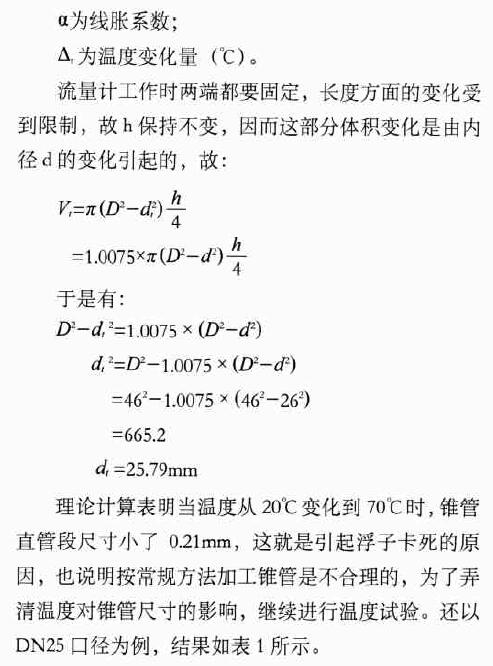 為了保持聚四氟乙烯零件尺寸的穩(wěn)定性,規(guī)定其溫度應用范圍是70℃以下。在試制的初始階段,用常規(guī)加工方法,即按圖紙尺寸進行錐管和浮子的加工,可以發(fā)現(xiàn),在常溫下工作正常的浮子在高溫試驗中出現(xiàn)了卡死現(xiàn)象,反復的試驗都得到同樣的結果。實際測量表明:浮子尺寸變化不大,因此推斷是由于錐管尺寸的變化引起卡死現(xiàn)象。通過理論計算,得出結論,以利改進。