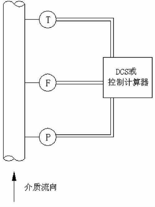 流量計(jì)、溫度變送器、壓力變送器單獨(dú)安裝,流量信號、溫度信號、壓力信號分別輸入DCS或控制計(jì)算器進(jìn)行流量的溫度、壓力補(bǔ)償計(jì)算,完成流量、壓力、溫度各參數(shù)的顯示、輸出、打印等功能。此種結(jié)構(gòu)安裝靈活,特別適用于現(xiàn)場流量計(jì)的升級改造,如圖2所示。號、溫度信號、壓力信號輸入到溫壓補(bǔ)償功能設(shè)計(jì)的流量計(jì)轉(zhuǎn)換器中,進(jìn)行流量的溫度、壓力補(bǔ)償計(jì)算,完成流量、壓力、溫度各參數(shù)的顯示、輸出、打印等功能。此種結(jié)構(gòu)測量準(zhǔn)確度高,體積小,安裝方便,如圖3所示: