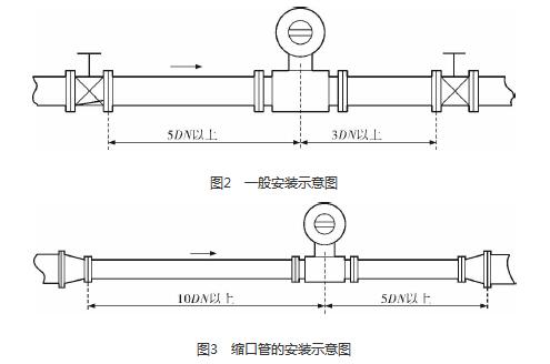 污水處理廠進水流量計的安裝質(zhì)量對其測量結(jié)果的影響較大,因此在安裝時需要注意幾個問題。*先,污水處理廠進水流量計直管段的選擇在配管時一定要按照要求進行選擇,一般選擇流量計通徑與工藝管道通徑相同,即可滿足工程需要,而且安裝方便、壓力損失小,流量計直管段上游側(cè)的長度不少于5倍工藝管道直徑,下游側(cè)的長度不少于3倍工藝管道直徑(圖2)。但在流速太慢而又要求精度較高或需要變徑的應(yīng)用場合,可選擇通徑小于工藝管道通徑的流量計,以提高測量精度,此時流量計上、下游必須加裝異徑管,且進口異徑管上游側(cè)應(yīng)有長于10倍工藝管道直徑的直管段,下游側(cè)應(yīng)有長于5倍工藝管道直徑的直管段(圖3)。