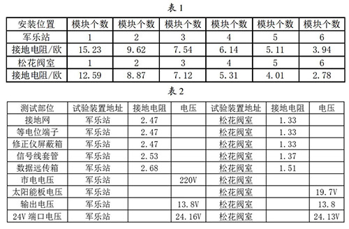 接地網(wǎng)的安裝與連接:接地網(wǎng)是整個(gè)色拉油流量計(jì)防雷試驗(yàn)比較關(guān)鍵的一個(gè)內(nèi)容,能不能準(zhǔn)確的論證試驗(yàn)的有效性,必須保證接地網(wǎng)達(dá)到標(biāo)準(zhǔn)的接地電阻,通過(guò)對(duì)實(shí)地地電阻率的測(cè)試,初步選擇6個(gè)接地模塊埋設(shè)并配用降阻劑使用,邊安裝邊測(cè)試直到達(dá)到標(biāo)準(zhǔn)值后才引入等電位箱。在軍樂(lè)站和松花閥室安裝模塊并測(cè)試數(shù)據(jù)見(jiàn)表1。