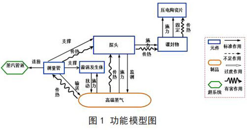 建立已有系統(tǒng)的功能模型(見圖 1)。通過(guò)功能模型分析,描述了系統(tǒng)元件及其之間的相互關(guān)系,并得出導(dǎo)致傳感器耐受溫度不足問(wèn)題的功能因素:高溫蒸氣對(duì)測(cè)量管傳熱;測(cè)量管對(duì)探頭傳熱;探頭對(duì)灌封物傳熱;灌封物對(duì)壓電陶瓷片傳熱;高溫蒸氣對(duì)探頭傳熱。