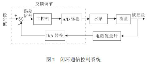 通信控制系統(tǒng)由工控機(jī)、變頻器、水泵、數(shù)據(jù)采集卡、化工污水流量計(jì)等組成。在整個(gè)熱量表耐久性試驗(yàn)裝置中,化工污水流量計(jì)與被試驗(yàn)熱量表串聯(lián)在試驗(yàn)管路中。系統(tǒng)設(shè)定流量值 qs,通過(guò)工控機(jī)發(fā)送信號(hào)給變頻器,來(lái)控制水泵運(yùn)轉(zhuǎn),系統(tǒng)通過(guò)研華數(shù)據(jù)采集卡 PCI1711 將采集到的化工污水流量計(jì)當(dāng)前瞬時(shí)流量值反饋給工控機(jī),工控機(jī)將返回流量值與設(shè)定流量值qs進(jìn)行比較,從而確定是否需要重新調(diào)整變頻器頻率控制水泵轉(zhuǎn)速。此過(guò)程是一個(gè)完整的閉環(huán) PID 控制過(guò)程,其閉環(huán)控制過(guò)程如圖 2 所示。 2. 2 管路切換系統(tǒng)管路切換主要由冷熱水箱、水泵、開(kāi)關(guān)閥等組成。要實(shí)現(xiàn)熱量表耐久性 4000 次冷熱沖擊試驗(yàn),需要實(shí)時(shí)控制管路中熱水與冷水的交替使用。