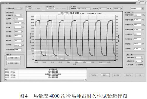 本文研究的 4000 次冷熱沖擊試驗(yàn)的實(shí)現(xiàn)具有以下特點(diǎn): (1)基于“工控機(jī) +水泵 + 化工污水流量計(jì)”的閉環(huán)控制系統(tǒng),實(shí)現(xiàn)了流量自動(dòng)反饋調(diào)節(jié),滿足試驗(yàn)要求; (2)通過(guò)四個(gè)開(kāi)關(guān)閥的時(shí)序切換,自動(dòng)控制試驗(yàn)溫度,很好的完成了 4000 次溫度沖擊試驗(yàn); (3)通過(guò)“工控機(jī) + 數(shù)據(jù)數(shù)據(jù)采集卡”的數(shù)據(jù)采集系統(tǒng),實(shí)時(shí)監(jiān)控試驗(yàn)過(guò)程中的流量、溫度、壓力等相關(guān)參數(shù),實(shí)現(xiàn)試驗(yàn)方式的自動(dòng)控制,并能對(duì)試驗(yàn)數(shù)據(jù)進(jìn)行分析與評(píng)定。 (4)試驗(yàn)的全過(guò)程為智能自動(dòng)化,可無(wú)人員留守看護(hù)。試驗(yàn)結(jié)果可直接反映出熱量表在長(zhǎng)時(shí)間運(yùn)行后的可靠性。為我國(guó)熱量表耐久性試驗(yàn)研究提供檢測(cè)手段,為促進(jìn)產(chǎn)品質(zhì)量提升做好技術(shù)保障。