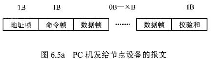 在分體式電磁流量計(jì)等節(jié)點(diǎn)設(shè)備和C機(jī)通信的過程中,由地址幀、命令幀、數(shù)據(jù)幀、校驗(yàn)和可組成各種功能不同的報(bào)文。由于采用主從工作方式來實(shí)現(xiàn)通信,分體式電磁流量計(jì)等節(jié)點(diǎn)設(shè)備僅能接收并執(zhí)行PC機(jī)發(fā)送來的控制命令,而不能發(fā)送命令給PC機(jī)。因此,由PC機(jī)發(fā)往流量計(jì)等節(jié)點(diǎn)設(shè)備的報(bào)文一般包括一個(gè)地址幀,一個(gè)命令幀,若干個(gè)數(shù)據(jù)幀和一個(gè)校驗(yàn)和,其報(bào)文格式圖.6a5所示;而由流量計(jì)等節(jié)點(diǎn)設(shè)備發(fā)往PC機(jī)的報(bào)文一般包括一個(gè)地址幀,若干個(gè)數(shù)據(jù)幀和一個(gè)校驗(yàn)和,其報(bào)文格式如圖6.5b所示。