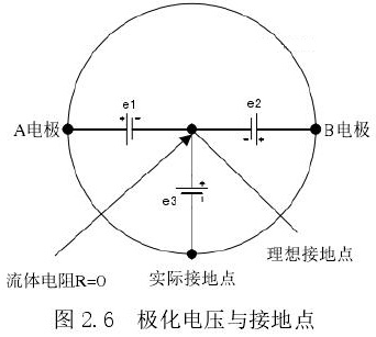 直流干擾主要來源于濃硫酸流量計(jì)工作時(shí)出現(xiàn)的電化學(xué)噪聲。當(dāng)電解質(zhì)和接液部件一旦接觸,電解質(zhì)中的正負(fù)離子將會(huì)即刻出現(xiàn)定向運(yùn)動(dòng),即使沒有通電,電解質(zhì)中的正負(fù)離子會(huì)產(chǎn)生一個(gè)定向運(yùn)動(dòng),此時(shí)在電解液中會(huì)形成一個(gè)明顯的電位差,出現(xiàn)的此種現(xiàn)象被稱為極化現(xiàn)象??蓮膱D 2.6 中進(jìn)行觀察,兩個(gè)電極若是產(chǎn)生了大小相等,方向相反的電位e1=e 2時(shí),兩個(gè)電極之間的電位差可視為零;當(dāng)兩個(gè)電極之間的電位呈現(xiàn)出e1 ≠e2 的關(guān)系時(shí)則表示兩個(gè)電位之間存在一個(gè)明顯的電位差,產(chǎn)生的電位差之間則會(huì)出現(xiàn)相應(yīng)的電流從而形成極化電壓。此電壓與共模電壓3e 將會(huì)共同被轉(zhuǎn)換器前的放大器攝取,此時(shí)極有可能會(huì)出現(xiàn)放大器無法工作的情況,此種情況主要是由于極化電壓過大所導(dǎo)致,當(dāng)極化電壓較大時(shí)將會(huì)把放大器的輸入端堵塞,此時(shí)放大器無法正常工作。為了能有效的避免發(fā)生此種情況需要控制降低在電磁場中所產(chǎn)生的極化電壓。