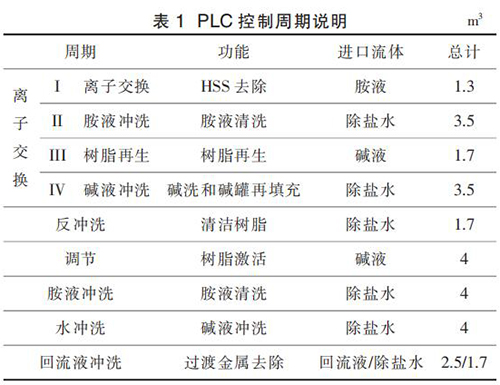 APU 的運(yùn)行按照事先設(shè)定的程序運(yùn)行,即嚴(yán)格遵循設(shè)定的步驟順序。 APU 的正確運(yùn)行依賴于每個(gè)步驟的順利完成。 按照預(yù)先設(shè)定好的步驟完成 1 個(gè)任務(wù)即視為完成 1 個(gè) APU 運(yùn)行的“周期”。 離子交換的主周期被稱為“離子交換周期”。除此之外,整個(gè)控制程序還包含另外 5 個(gè)輔助周期, 分別為反沖洗周期、調(diào)節(jié)周期、胺液沖洗周期、水沖洗周期、回流液沖洗周期。 這 5 個(gè)周期在維護(hù)和非計(jì)劃停車后重新啟動(dòng)時(shí)使用。 PLC 控制各個(gè)周期的說(shuō)明見表 1。