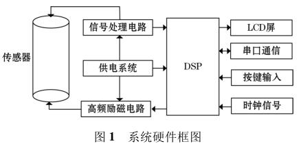 高頻勵磁管道流量計由傳感器、高頻勵磁電路、信號處理電路等組成,其中高頻勵磁電路決定著傳感器磁場的強弱,勵磁電路的穩(wěn)定性以及精確性決定著系統(tǒng)檢測的準確性以及穩(wěn)定性。DSP 系統(tǒng)控制勵磁電路激勵傳感器線圈,當線圈中有導電液體流過時,其切割磁感線并在傳感器兩端的線圈上產(chǎn)生感應電動勢,利用信號檢測電路監(jiān)測感應電動勢的大小,*后根據(jù)相應關(guān)系計算出液體的流量,系統(tǒng)硬件框圖如圖 1 所示。