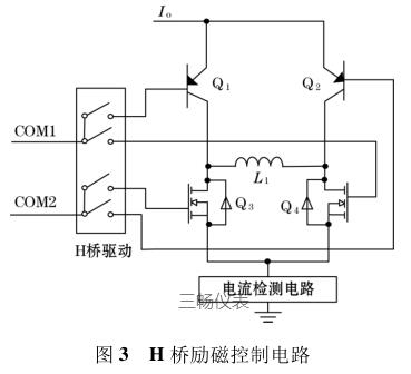 如圖2 所示,在對傳感器線圈進行勵磁時,通過比較器控制切換開關(guān)切換高低壓進行勵磁。V ref 作為比較器的基準輸入端,其表示勵磁電流的電壓穩(wěn)態(tài)值;而 C ur 則表示 H 橋勵磁電路中檢測到的電壓信號。一開始當系統(tǒng)處于低壓勵磁狀態(tài)時,系統(tǒng)會自動斷開切換電路中的電流旁路,此時系統(tǒng)通過利用 H 橋向勵磁線圈提供恒定電流。當勵磁方向變化時,電流檢測電路就會檢測到電流變?yōu)樨摲较?,比較器的 C ur 端與V ref 端的平衡就會發(fā)生變化,此時系統(tǒng)通過比較器自動切換為高壓勵磁狀態(tài)。與低壓勵磁方式相反,在此種狀態(tài)下,恒流控制電路關(guān)閉而電流旁路打開,線圈中的能量就會存儲在能量回饋電路中,此時 C 1 端的電壓會超過高壓源。等勵磁線圈中的能量釋放完后,電流逐漸降為零,此時能量回饋電路就會利用電流旁路和 H 橋?qū)⒛芰糠答伣o勵磁線圈。當電容 C 1 端的電壓下降到小于高壓源時,系統(tǒng)就會自動通過電流旁路和H 橋直接對勵磁線圈進行勵磁,當勵磁線圈中的電流超過設定閾值時,C ur 端電壓就會大于 V ref 點電壓,此時比較器又會切換成低壓勵磁方式,如此反復循環(huán)控制,達到對勵磁線圈恒流控制的目的。圖 3 為 H 橋勵磁控制電路。