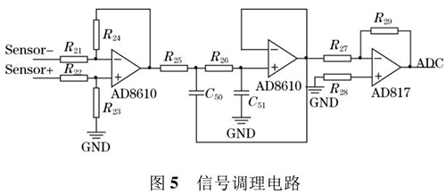 如圖4 所示,信號調(diào)理電路由前置放大電路、濾波電路以及二次放大電路組成。其中前置放大電路主要是由 AD8610 組成的差分放大電路構(gòu)成,其主要是去除信號中的共模干擾并且進行*一次前置放大,前置放大電路的放大倍數(shù)為 15。由于有效信號的幅值很小,經(jīng)過前置放大電路后信號中還存在很多高頻雜波,這些雜波會影響對后級信號的處理,因此還需要對前置放大電路輸出的信號進行低通濾波和二次放大。系統(tǒng)選用二階有源低通濾波電路濾除信號中的高頻干擾,低通濾波的截止頻率設定在 6 kHz 左右,選用 AD817 組成的二次放大電路對濾波電路輸出的信號進行二次放大,將信號調(diào)理電路輸出的信號調(diào)整在 0~5 V 之間,*終利用 DSP 內(nèi)部的 AD 轉(zhuǎn)換器對此信號進行模數(shù)轉(zhuǎn)換得出傳感器線圈輸出的感應電動勢,從而根據(jù)相關(guān)的公式計算得出管道中液體的流量。具體電路圖如圖 5 所示。