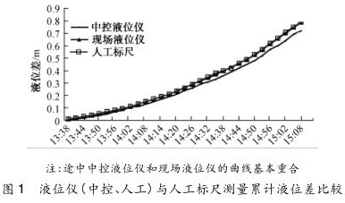 液位的測量是整個容積法校驗的重點,其準確度直接關(guān)乎計量結(jié)果。由于液位儀信號非數(shù)字傳輸,在測量過程中安裝了人工標尺這一液位簡易測量裝置,供校核液位儀使用。將測量的累計液位差同液位儀(中控、現(xiàn)場)測得數(shù)據(jù)進行比較,如圖 1 所示。