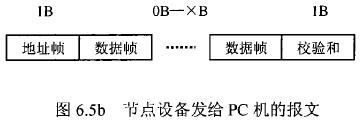在花生油流量計(jì)等節(jié)點(diǎn)設(shè)備和C機(jī)通信的過程中,由地址幀、命令幀、數(shù)據(jù)幀、校驗(yàn)和可組成各種功能不同的報(bào)文。由于采用主從工作方式來實(shí)現(xiàn)通信,花生油流量計(jì)等節(jié)點(diǎn)設(shè)備僅能接收并執(zhí)行PC機(jī)發(fā)送來的控制命令,而不能發(fā)送命令給PC機(jī)。因此,由PC機(jī)發(fā)往流量計(jì)等節(jié)點(diǎn)設(shè)備的報(bào)文一般包括一個(gè)地址幀,一個(gè)命令幀,若干個(gè)數(shù)據(jù)幀和一個(gè)校驗(yàn)和,其報(bào)文格式圖.6a5所示;而由流量計(jì)等節(jié)點(diǎn)設(shè)備發(fā)往PC機(jī)的報(bào)文一般包括一個(gè)地址幀,若干個(gè)數(shù)據(jù)幀和一個(gè)校驗(yàn)和,其報(bào)文格式如圖6.5b所示。