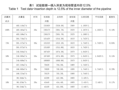氣體渦輪流量計插入深度為現(xiàn)場管道內(nèi)徑的 12.5%時,試驗數(shù)據(jù)如下(以 DN200 為例):