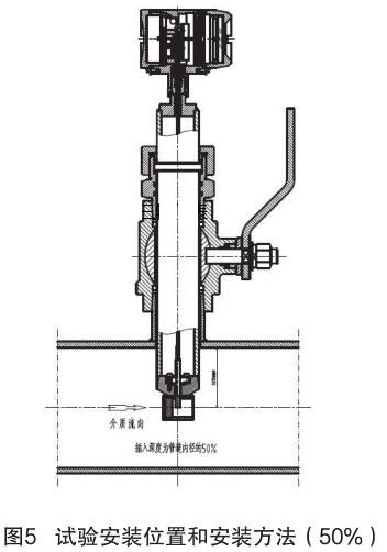 對氣體渦輪流量計和插入式電磁流量計的結構原理進行分析,插入式電磁流量計的信號采集點在標校管道內(nèi)12.5% 為宜,因它屬電磁類流量計,而煙氣流量計是根據(jù)“卡門渦街”原理進行測量管道內(nèi)流量,根據(jù)標校管道內(nèi)層流和湍流的分析,以及氣體渦輪流量計獨特的探頭結構形式,確定氣體渦輪流量計的插入深度為標校管道內(nèi) 50%,試驗安裝位置和安裝方法如圖 5 所示。