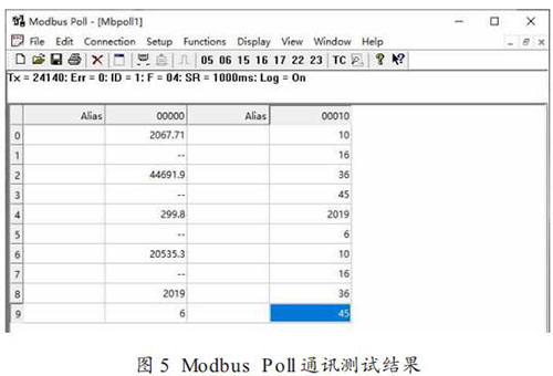 Modbus Poll 通訊測試結果如圖 5 所示:Tx = 24140,Err =0,ID = 1,F(xiàn) = 04,SR = 1000ms,Log = on。 其中 ,Tx 為Modbus Poll 發(fā)送命令次數(shù),也就是說在測試期間 Modbus Poll軟件共發(fā)送讀輸入寄存器命令 24140 次(發(fā)送間隔為 1s,測試時間為 6.7 小時);Err 為通訊錯誤數(shù),Err = 0 表明 Modbus 通訊模塊正確響應次數(shù)為 24140 次(錯誤數(shù)為 0)。