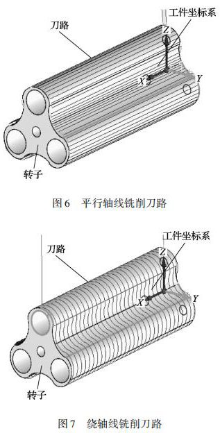 三葉轉子的曲面是由多條直線組成的直紋面,加工三葉轉子這種高精度的直紋曲面必須采用四軸或五軸聯(lián)動的數(shù)控機床。三葉轉子的銑削方式有刀具路徑平行軸線銑削、繞軸線銑削兩種刀具路徑。平行軸線銑削原理為: 刀具在轉子曲面上沿 X軸從轉子的一端移動到另一端銑出一條直線,銑削下一點位時旋轉 A 軸 Z 軸聯(lián)動再次從轉子一端銑削到另一端,采用往復銑削直到完成整個轉子曲面,刀具路徑如圖 6 所示。繞軸線銑削原理為: 刀具在轉子曲面上 AZ 軸聯(lián)動刀具繞 A 軸軸線銑削,銑削下一點位時移動 X 軸,再次 AZ 軸進行聯(lián)動銑削,采用往復銑削直到完成整個轉子曲面,刀具路徑如圖 7 所示。由于繞軸銑削需要 AZ 軸聯(lián)動切削,而數(shù)控機床可以達到的進給率是由*慢的軸決定的,所以,這種刀具路徑在精加工高速銑削時并不適用。