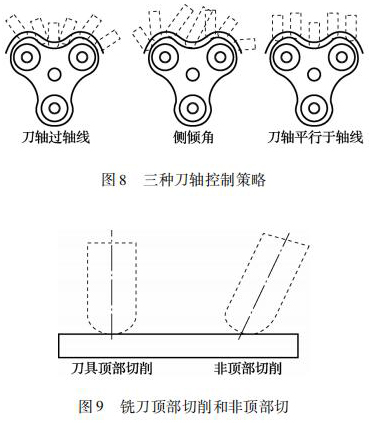 四軸加工中采用球頭銑刀,刀軸控制策略是提高加工效率和轉子曲面表面粗糙度的關鍵。如圖 8所示,刀軸控制策略有常見的刀軸過軸線、側傾角、刀軸平行于軸線。筆者采用平行軸線銑削加工方式對這 3 種刀軸控制策略進行實際加工對比,得出采用側傾角刀軸控制策略加工出的轉子曲面表面粗糙度*好。其原因主要由于刀軸平行于軸線這種刀軸控制策略采用球頭銑刀加工時,其刀具切削轉子曲面時的接觸點為刀具的頂部,球頭銑刀的頂部直徑為零,線速度也為零。此時刀具是在擠壓工件,刀具頂部也容易磨損。刀軸過軸線策略雖然刀具與轉子曲面的接觸點一直在變換,但是也有刀位點是采用刀具頂部去切削。側前傾角刀軸控制策略: 控制刀具與轉子曲面接觸點的位置,避免球頭銑刀頂部銑削轉子曲面,實現(xiàn)刀尖的點的偏離,提高刀具切削點的線速度。球頭銑刀頂部切削和非頂部切削如圖 9 所示。