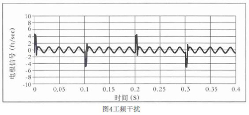 工頻干擾是高溫電磁流量計(jì)常見(jiàn)的干擾源。當(dāng)流量計(jì)處于電源形成電磁場(chǎng)中時(shí),由于分布電容的存在,以電磁波的輻射形式干擾電極信號(hào),或者是由供電電源引入的工頻串?dāng)_,工作現(xiàn)場(chǎng)的工頻共模干擾,其產(chǎn)生的物理機(jī)理均是電磁感應(yīng)原理。幅度與流量信號(hào)相比,往往要大幾個(gè)數(shù)量級(jí),頻率與供電電源頻率相同。如圖4所示,線(xiàn)圈驅(qū)動(dòng)頻率為5Hz的電極信號(hào),被耦合了50Hz的工頻干擾,幅度大概相當(dāng)于1feet/s。