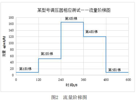 該測試主要利用實(shí)驗室測試條件,模擬客戶現(xiàn)場使用情況。其主要測試內(nèi)容包括:測試高溫液體流量計在+23℃,-30℃和-40℃三種溫度下,高溫液體流量計出口壓力分別在2.1kPa和30kPa時,流量分別從*1階梯到*5階梯時的響應(yīng)速度,客戶所提供的流量階梯如圖2所示。橫軸表示下游球閥開啟動作時間,縱軸表示高溫液體流量計下游需要的流量q。