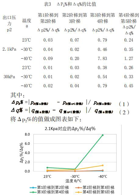為了更直觀嚴(yán)謹(jǐn)?shù)膶Ρ让總€階段響應(yīng)速度的不同,對原始數(shù)據(jù)進(jìn)行處理,得到如下表格2和表格3。將△p2%/△q%作為響應(yīng)速度的直觀量化表達(dá),若△p2%/△q%的值大,說明單位流量變化照成的出口壓力變化大,即說明高溫液體流量計響應(yīng)相對較慢,反之亦然。