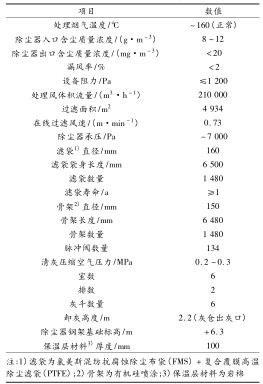 (2) 新建布袋除塵及氣力輸灰管道式渦街流量計。采用長袋低壓脈沖袋式(外濾式)除塵器,煙氣體積流量為 210 000 m 3 /h,初 始 含 塵 質(zhì) 量 濃 度 為 8 ~12 g/m 3 ,除塵占地面積為 20 m 2 (5 m ×4 m)。除塵器主要由本體、壓縮空氣系統(tǒng)、控制系統(tǒng)、輸灰系統(tǒng)組成。除塵器后進脫硫塔煙塵質(zhì)量濃度≤20 mg/m 3 。除塵器的總阻力≤1 200 Pa。新建布袋除塵器型號為 LCMD-4934,設(shè)計參數(shù)見表 2,其中清灰方式采用離線清灰,除塵器布置方式為矩形布置,電氣控制采用可編程邏輯控制器(PLC)。