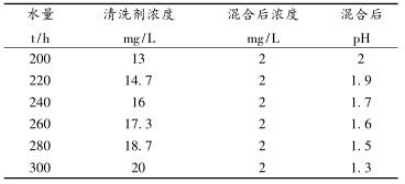 (2)加酸期間附企水處理公司人員負(fù)責(zé)每0.5h在高架水槽處化驗(yàn)污環(huán)水pH值,每2h監(jiān)測一次高架水槽內(nèi)掛片腐蝕情況,將化驗(yàn)結(jié)果告知燃?xì)鈲徫蝗藛T,崗位職工負(fù)責(zé)記錄。當(dāng)pH小于6時,附企給水人員在高架水槽處加入堿液進(jìn)行調(diào)整,同時根據(jù)洗滌塔循環(huán)水量變換情況調(diào)整清洗劑濃度見表3。