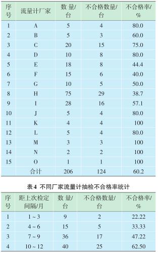 主要分析了油田內(nèi)常用廠家產(chǎn)品的檢定合格率,各廠家流量計(jì)檢定合格率對(duì)比見(jiàn)表3。從表3中可以看出:氣體流量計(jì)周期內(nèi)誤差超差概率偏大,總體達(dá)60%。